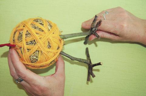 Nyní sennou kouli obtočte žlutou vlnou tak, jako byste namotávali klubíčko. Prosvítající seno úplně nezakrývejte.