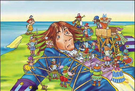 Paprsky ranního slunce probudily Gullivera z hlubokého spánku. Chtěl se posadit a rozhlédnout se kolem. Ale co to? Zjistil, že leží na zádech a nemůže se ani pohnout – celé tělo, ruce, nohy ba i své dlouhé vlasy měl pevně připoutány jemnými pevnými lanky, upevněnými na kolících zaražených do země. S velkým úsilím se mu podařilo trochu uvolnit levou ruku a pootočit hlavu. Pocítil, že po jeho noze se cosi pohybuje; pohyb pokračoval po těle směrem k hlavě. Gulliver sklopil oči a spatřil lidského tvora, ozbrojeného lukem a šípy. Gulliver nevěřil svým očím – ten človíček byl vysoký asi jako pivní sklenice. Když se Gulliverovi podařilo pootočit hlavu a pohlédnout na zem vedle sebe, spatřil desítky droboučkých lidiček, jak na něj míří malinkými šípy.