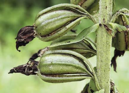 Pukající plody kruštíku širolistého. Z prasklých švů tobolky vypadávají drobná semena.