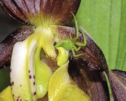 Běžník Misumena vatia v květu s kořistí Běžník Misumenops tricuspidatus v květu Cypripedium calceolus
