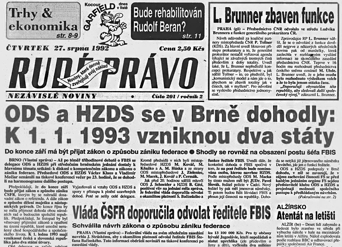 Ve 24.00 hodin 31. prosince přestalo Československo existovat –rozdělilo se na Českou republiku a Slovenskou republiku.