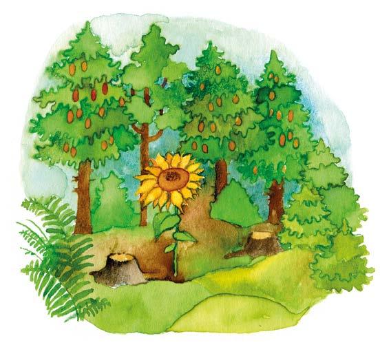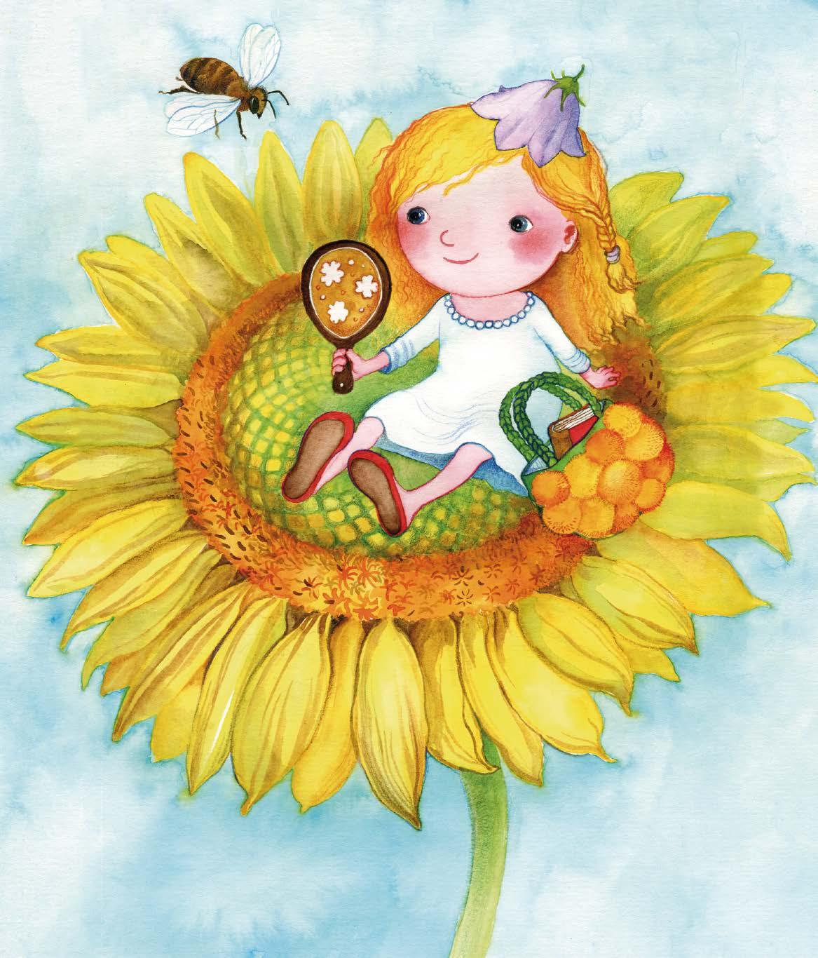 odpoledne vykvetla na opuštěné lesní mýtině veliká slunečnice a na jejím vrcholku se objevila maličká víla. Byla oblečená do tenkých šatů z bílé pavučiny, na dlouhých světlých vlasech měla klobouček připomínající modravý lesní zvonek, na nohou červené střevíčky a v ruce držela malou taštičku ze žlutých pampelišek.