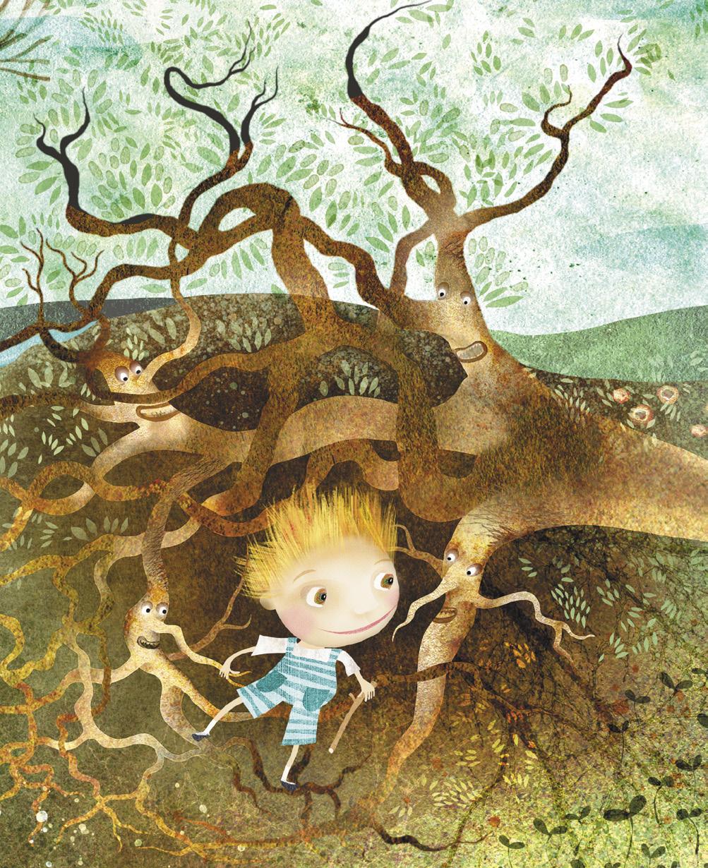 „Ententiky, bambuliky,“ ťuká Filípek hůlkou do suchých bukových kořenů. Rád si vymýšlí nová slova. Buk k němu natahuje kořenové ruce, vypadají jako malí skřítkové.