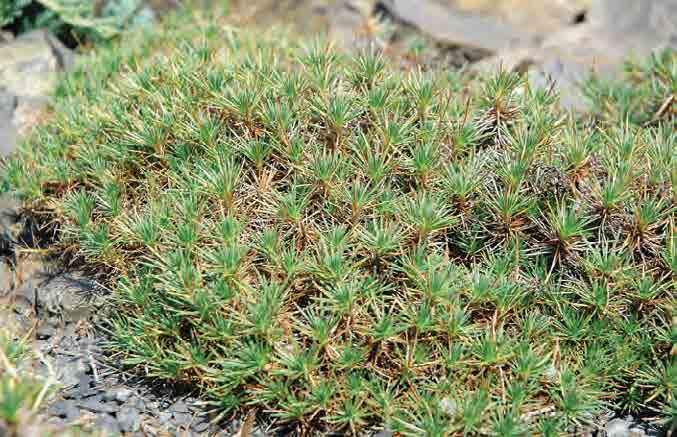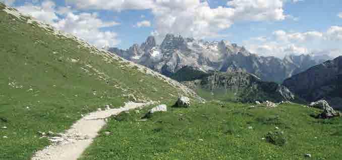 Itálie, Dolomiti di Braies, stezka na Dürrenstein, vysokohorské stanoviště, kde se vyskytují již pouze nejzakrslejší druhy dřevin (cca 2 400 m n. m.)