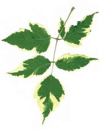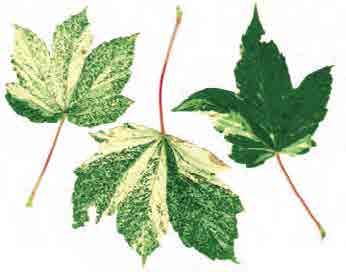 ‘Akikaze nishiki’; dobře větvený velký keř, výška 4–6 m nebo někdy více; listy jsou menší než má původní druh, nepravidelně 5–7laločné, bělopestré, občas jsou celé laloky nebo polovina čepele celá bílá