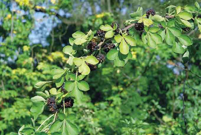 A. glabra Willd., j. lysý neboli pávie lysá; stromy 7–30 m v ysoké, borka drsná až silně popraskaná, letorosty jen v mládí pýřité, při rozmačkání nepříjemně páchnou; listy světle zelené, 5–7četné, lístky eliptické až obvejčité, 8–15 cm, zašpičatělé, jemně pilovité, na podzim naoranžovělé; květy světle žlutozelené, 2–3 cm velké, v řídkých latách 10–15(–22) cm, korunní lístky stejné, zelenavě žluté, kratší než tyčinky, V(–VI); plod je 3–5 cm tlustý, krátce a tupě ostnitý, vejcovitý až téměř kulovitý; východ USA; {Z5}