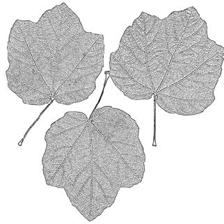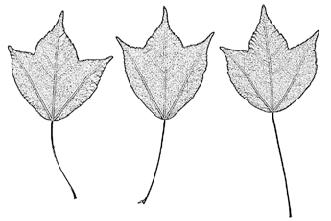 ‘Annae’; středně velký strom, dost hustě větvený, koruna asi tak vysoká jako široká, výška 10–20 m; listy 5–8 cm velké, při rašení tmavě červené, později leskle tmavozelené a k okrajům napurpurovělé, 3–5laločné, občas zvlněné, řapíky mléčí
