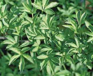‘Aureovariegata’; listy krémově a žlutě stříkané a mramorované