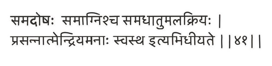 Jedinec, který udržuje všech pět elementů v harmonii včetně všech dhátů, což je přiměřené trávení – ágní, správné vylučování − malas, blažený stav ducha − atma, spokojené smysly − indrija a šťastný stav mysli − manas, tomu se říká zdravý člověk.