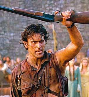 Campbell se během série změnil ze sympatického hrdiny ve stejně sympatického arogantního floutka, kterého nelze nemilovat. Přesto mu člověk tak trochu přeje všechno, čím mu režisér komplikuje život. Ash si cynicky utahuje z rytířů a považuje je za středověké burany, o své brokovnici mluví jako o hromové holi a neváhá se vrhnout do bitvy se šíleným úsměvem na rtech a motorovou pilou místo ruky, aniž by mu docházelo, že ve středověku do ní jen těžko sežene benzín. To, že se mu Knihu mrtvých povede najít, ale zapomene zaklínadlo, které