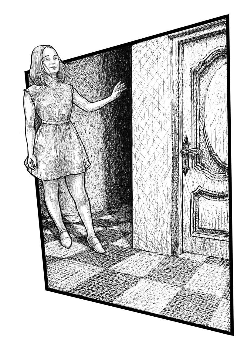 “Where did the White Rabbit go? How will I ever get out of here?” she thought and sadly walked to the middle of the room. Then she saw a little glass table with three legs. On the table was a tiny gold key. Alice took the key and tried it in all the doors but, unfortunately, either the locks were too big or the key was too small and she could not open any of them.