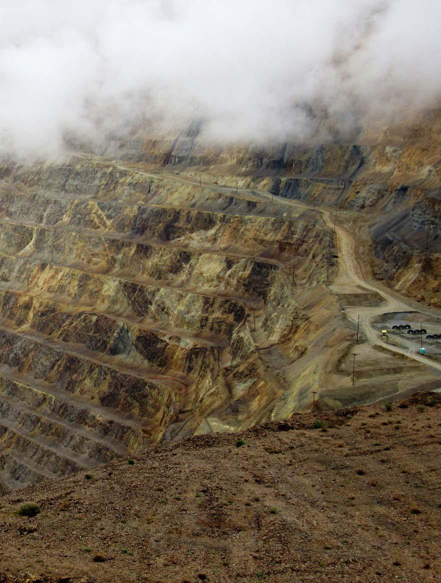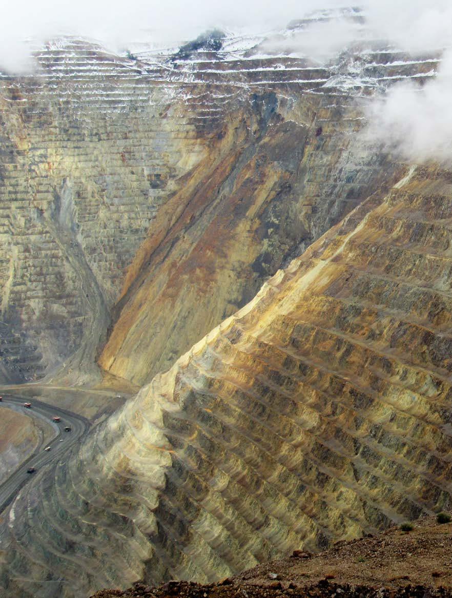 Důl Bingham Canyon v Utahu v USA je považován za nejhlubší povrchový důl na světě. Je hluboký 1 210 metrů a v nejširším bodě má 4 kilometry. Od roku 1906 se tu těží měď. Drobné tečky viditelné na cestě vlevo dole jsou obří dumpery, o kterých se můžete dočíst dále.