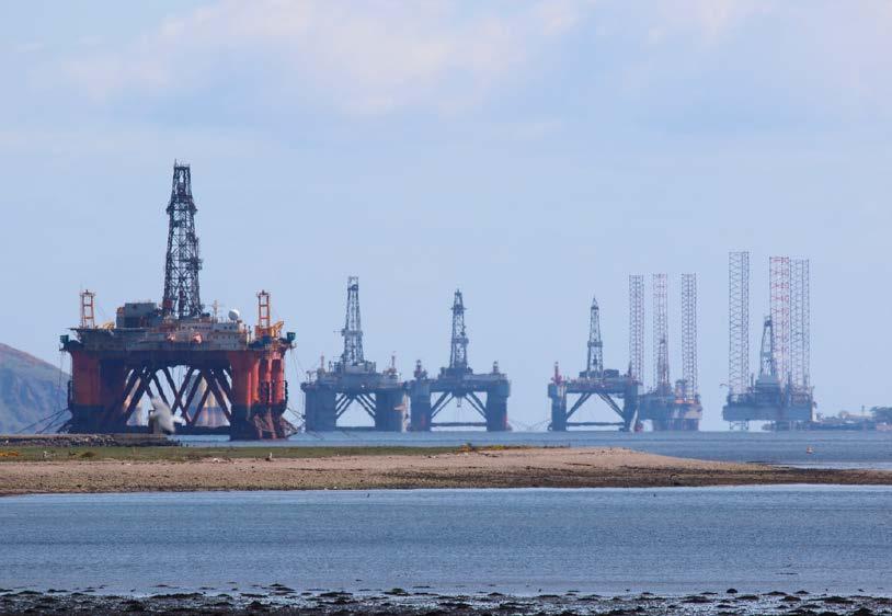 Odstavené vrtné plošiny nedaleko skotského městečka Cromarty. Místní záliv je využíván jako parkoviště (nebo hřbitov, chcete-li) pro dočasné umístění těchto těžebních gigantů ze Severního moře – dokud nebudou sešrotovány nebo dokud se jejich vlastníkům znovu nevyplatí je začít využívat.