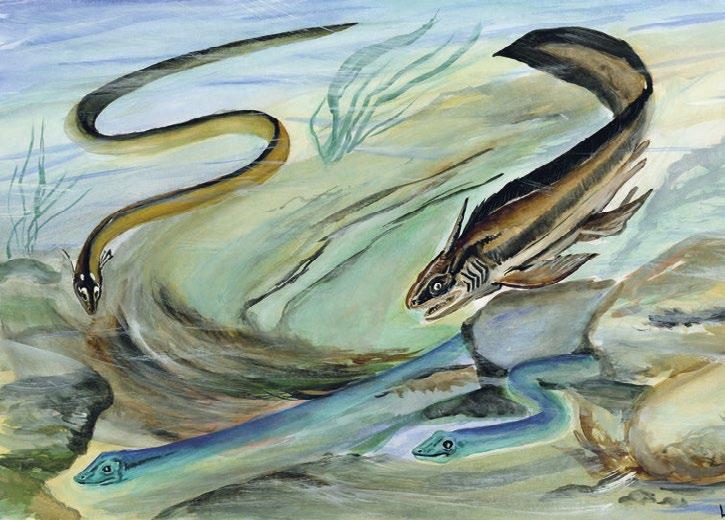 Opodál vyplave zpod kamenů tvor podobný hadovi. Stříbrně se leskne. I on se vrhá na jednu z ryb. Chytá ji a stahuje se s ní zpět pod kameny. Jde o obojživelníka ze skupiny aistopodů. Jmenuje se Phlegethontia a dorůstá délky až jeden metr. Praobojživelníci se vyvinuli z ryb. Ploutve se jim proměnily v končetiny. Jsou to předkové všech čtyřnohých živočichů – od žab přes ještěrky, myši, slony po lidi. V karbonu se rozšířili po celé souši, takřka ve všech možných podobách i velikostech. Ti nejmenší měří sotva centimetr, ti největší skoro dva metry. Taky o jejich výzkum se zasloužil Antonín Frič. Obrať na 99.