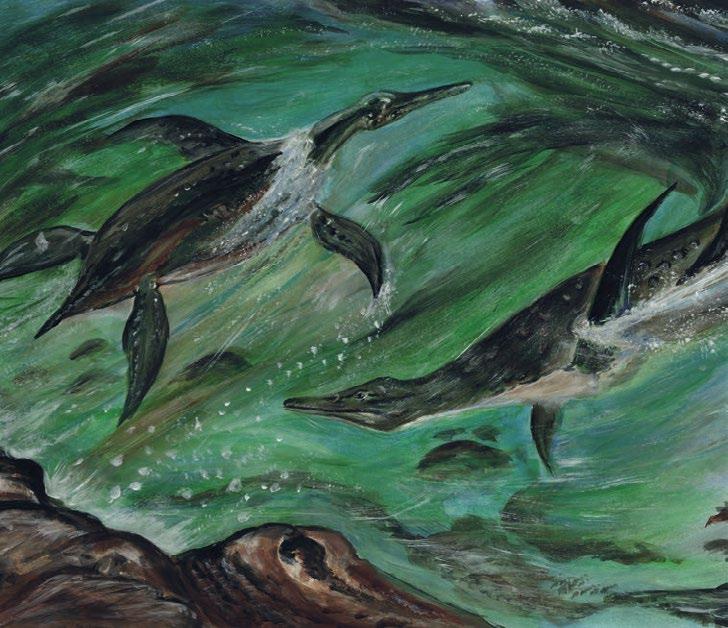 Voda je tak průzračná, že vidíš až na dno. To je plné padlých kmenů. Plavou mezi nimi ryby s velikými šupinami a zubatými tlamičkami. Jsou zmatené. Chvíli plavou nalevo, chvíli zase napravo. Náhle mezi ně vpadne šedá paryba. Je to Xenacanthus, sladkovodní