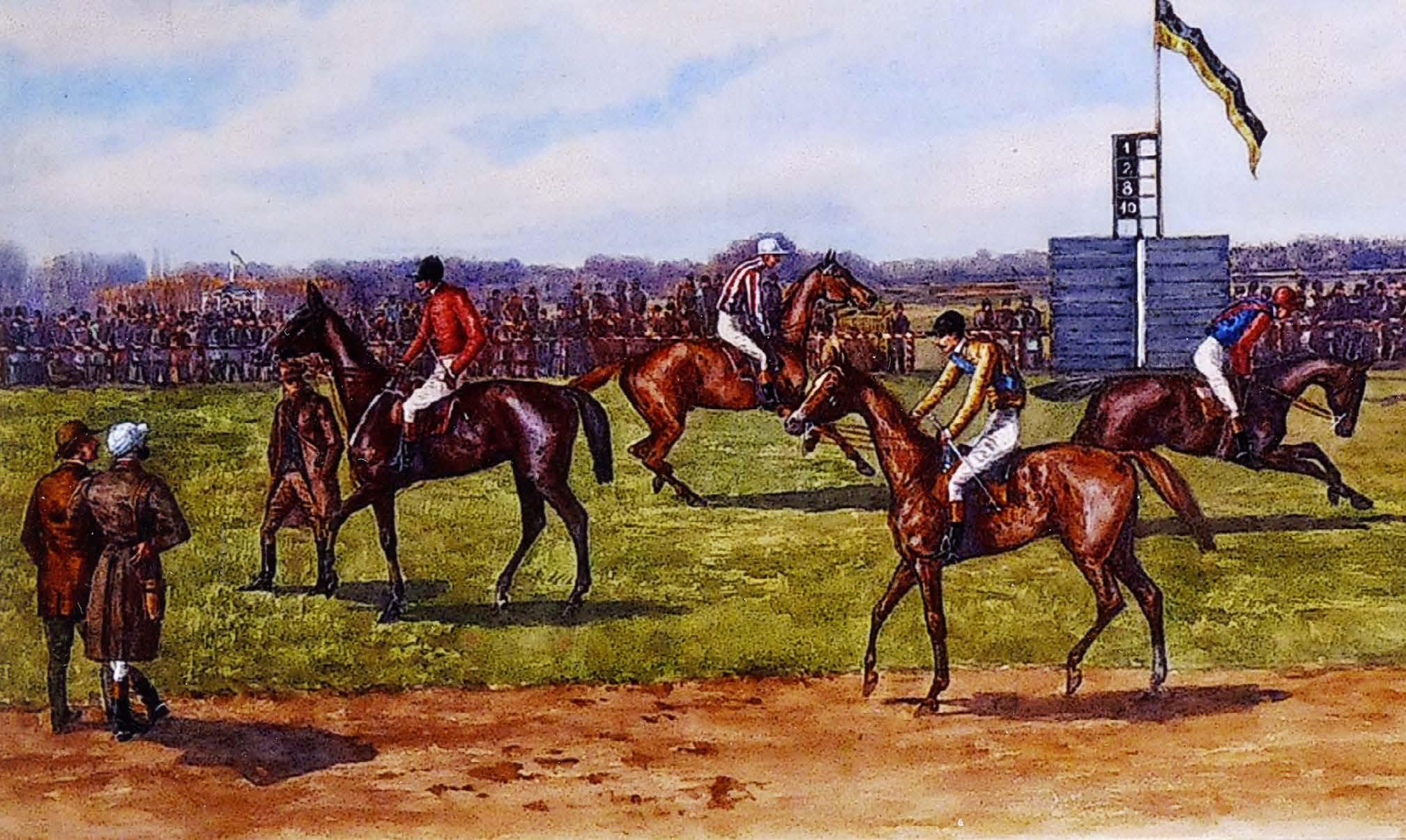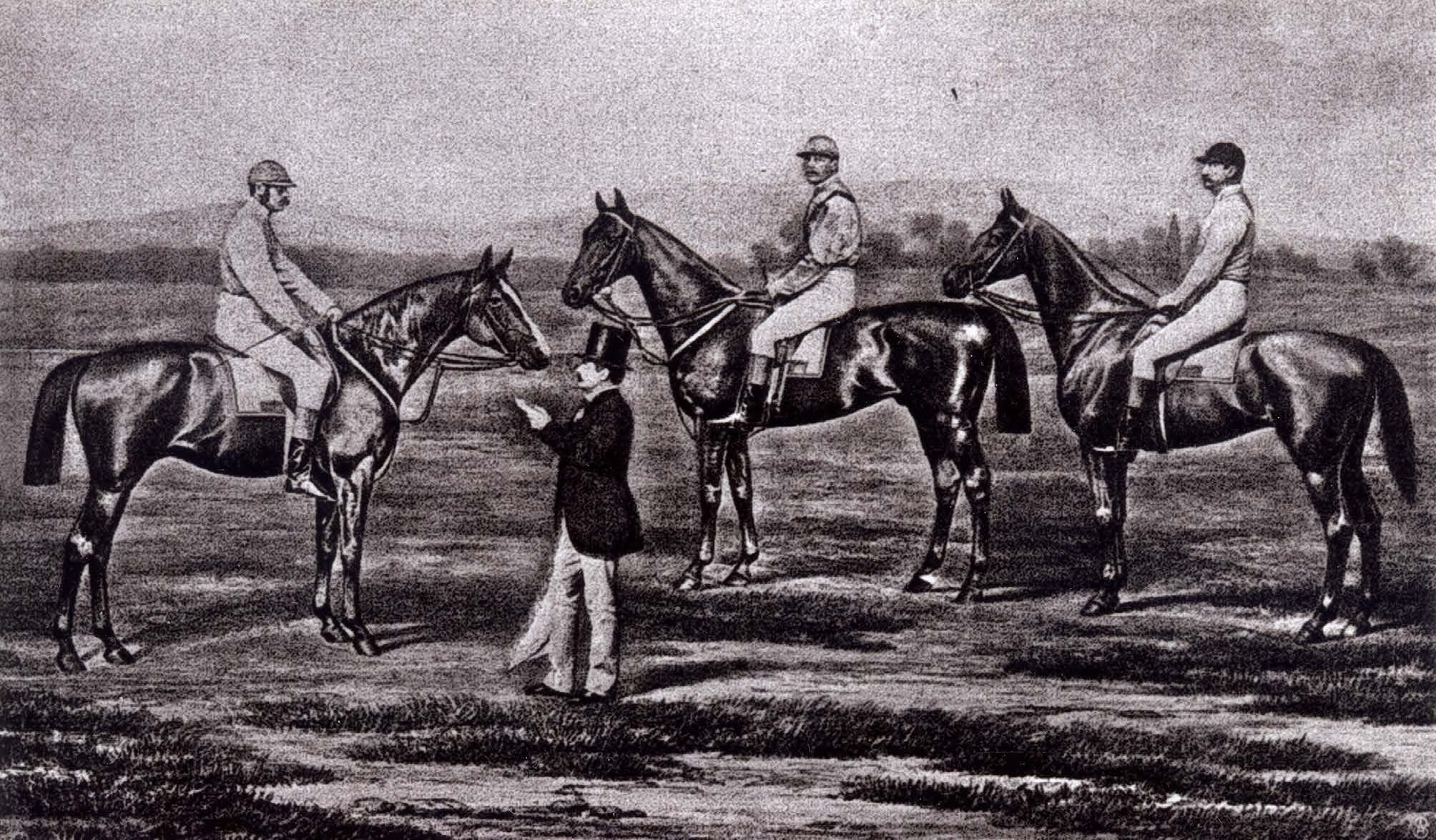 Před startem Velké pardubické 1877. Vlevo Herodes a bělouš Liverpool s jezdci M. O. Priorem a H. Friesem v červeno-bílých barvách hraběte Oktaviána Kinského, nadporučík R. Söllinger na klisně Hopeful, Brigand při sedlání a vpravo od něho F. Metternich v rozmluvě s majitelem koně. Vzadu hřebec Dieppe a jezdec G. Sayers a vpravo baron E. Falkenhausen v sedle své klisny Nachtschwalbe a vedle něho jezdec G. Herbert ve fialovo-žlutých barvách. (archiv autora)