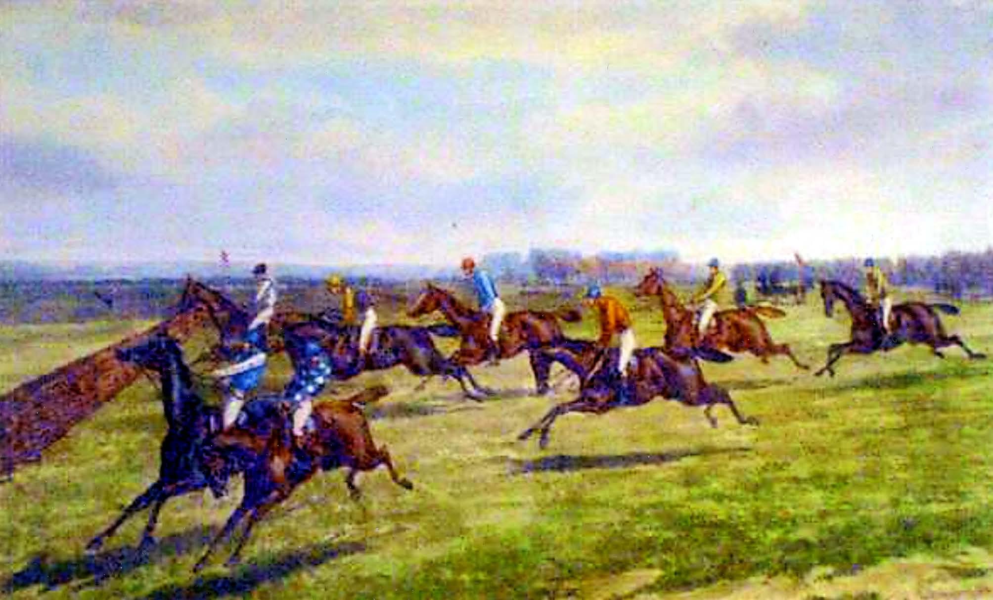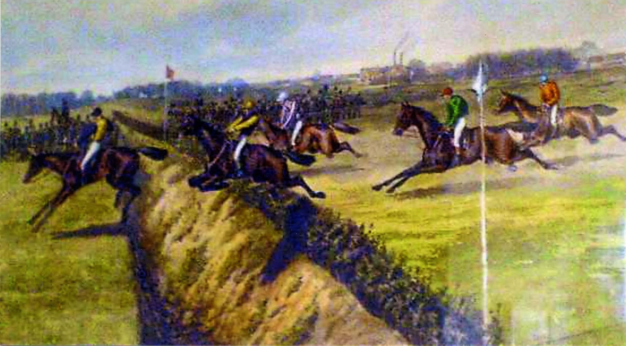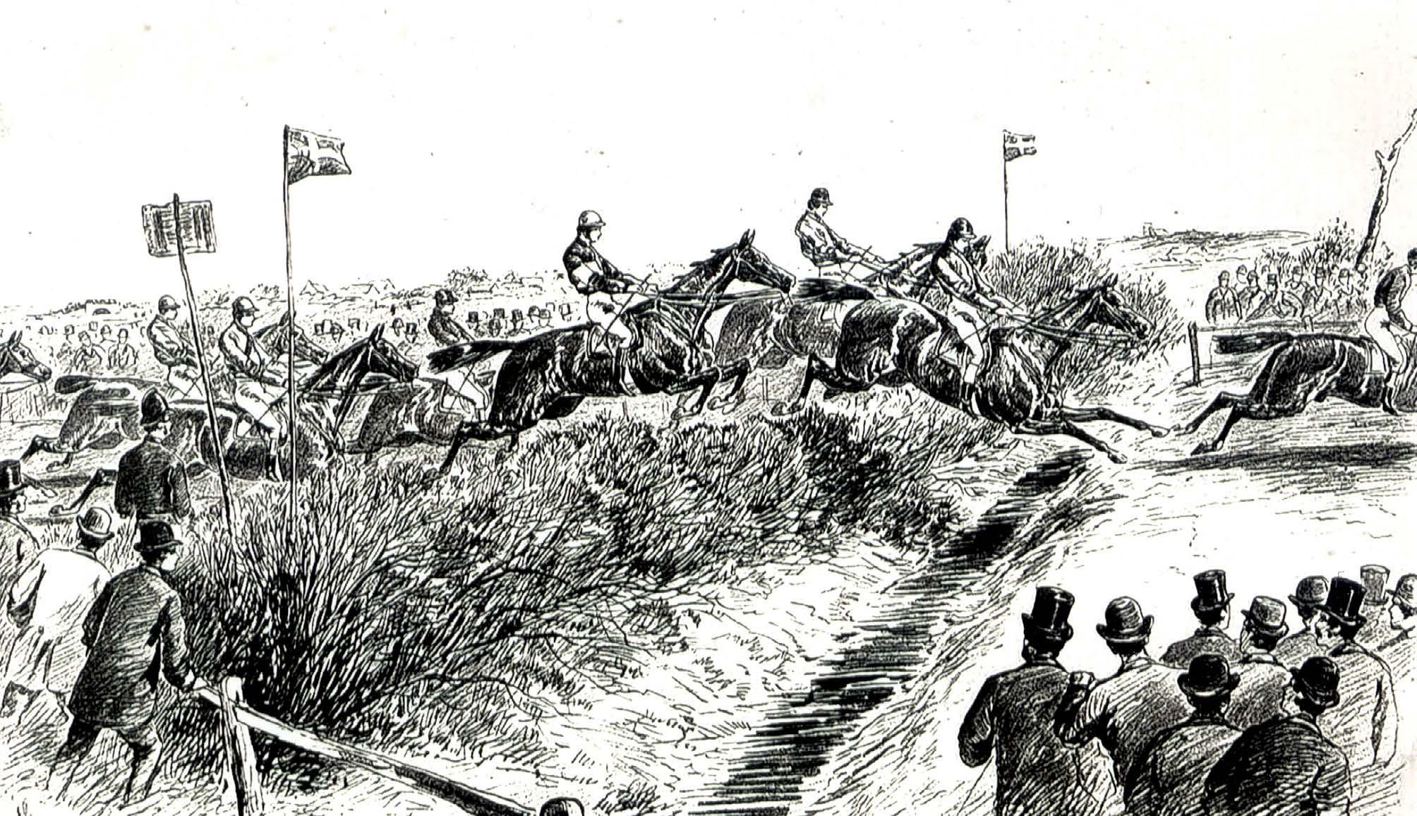 Velká národní v Aintree v roce 1876. Překážka zvaná Becher´s Brook podle kapitána Bechera, který tu spadl s koněm Conradem v roce 1839. (archiv autora)