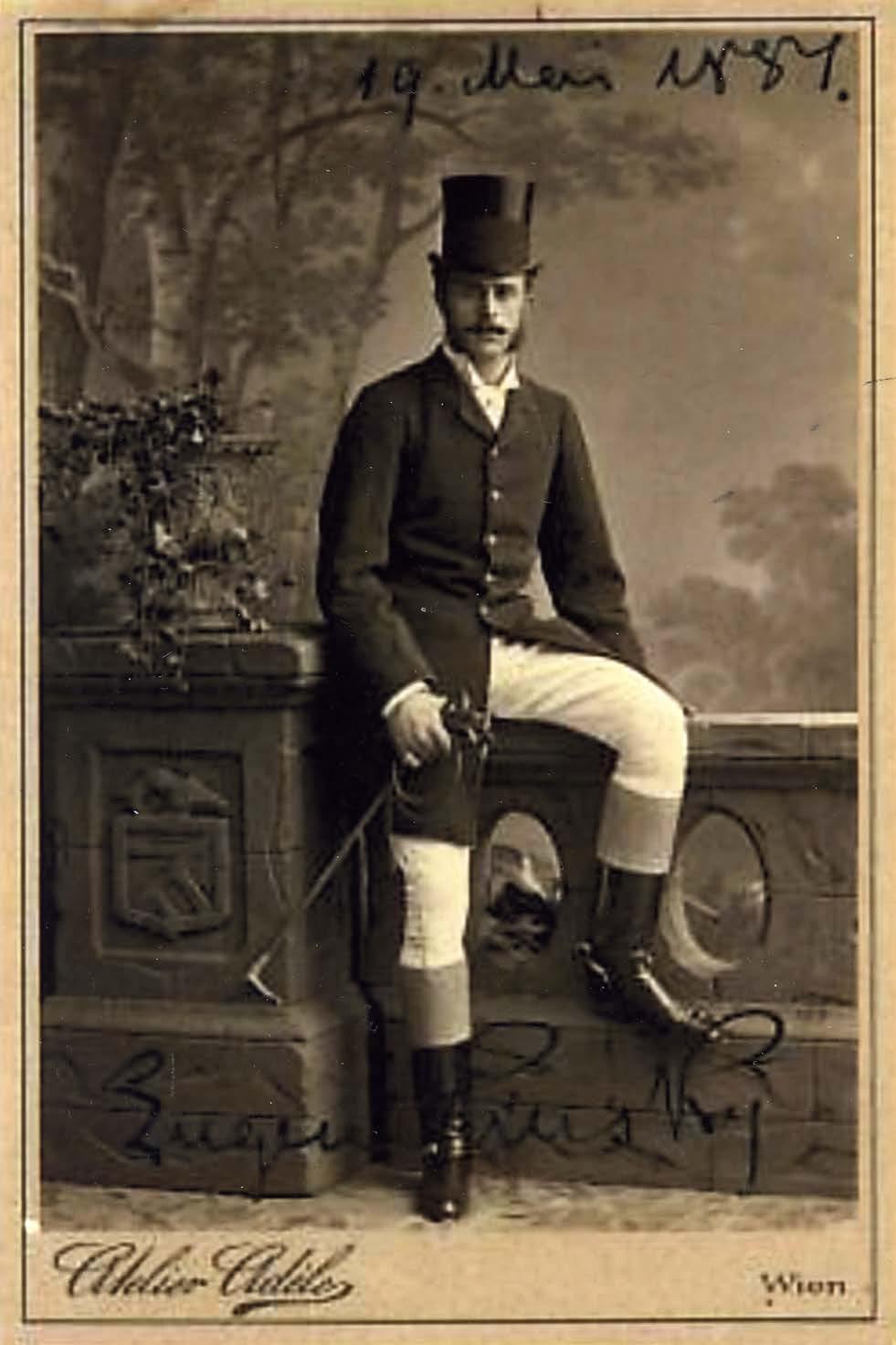 Hrabě Eugen Kinský byl v sedle klisny Virago v roce 1877. Virago patřila Eugenovu bratru Zdenkovi, byla jeho prvním koněm ve Velké pardubické. (archiv autora)