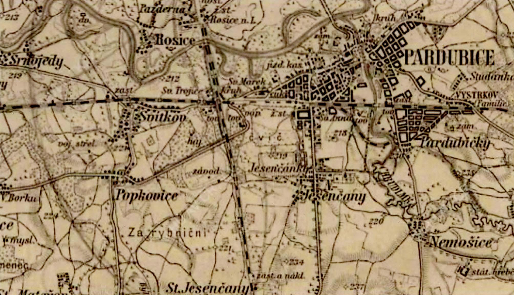 Mapa Pardubic a okolí z roku 1877, na které je vyznačeno závodiště.