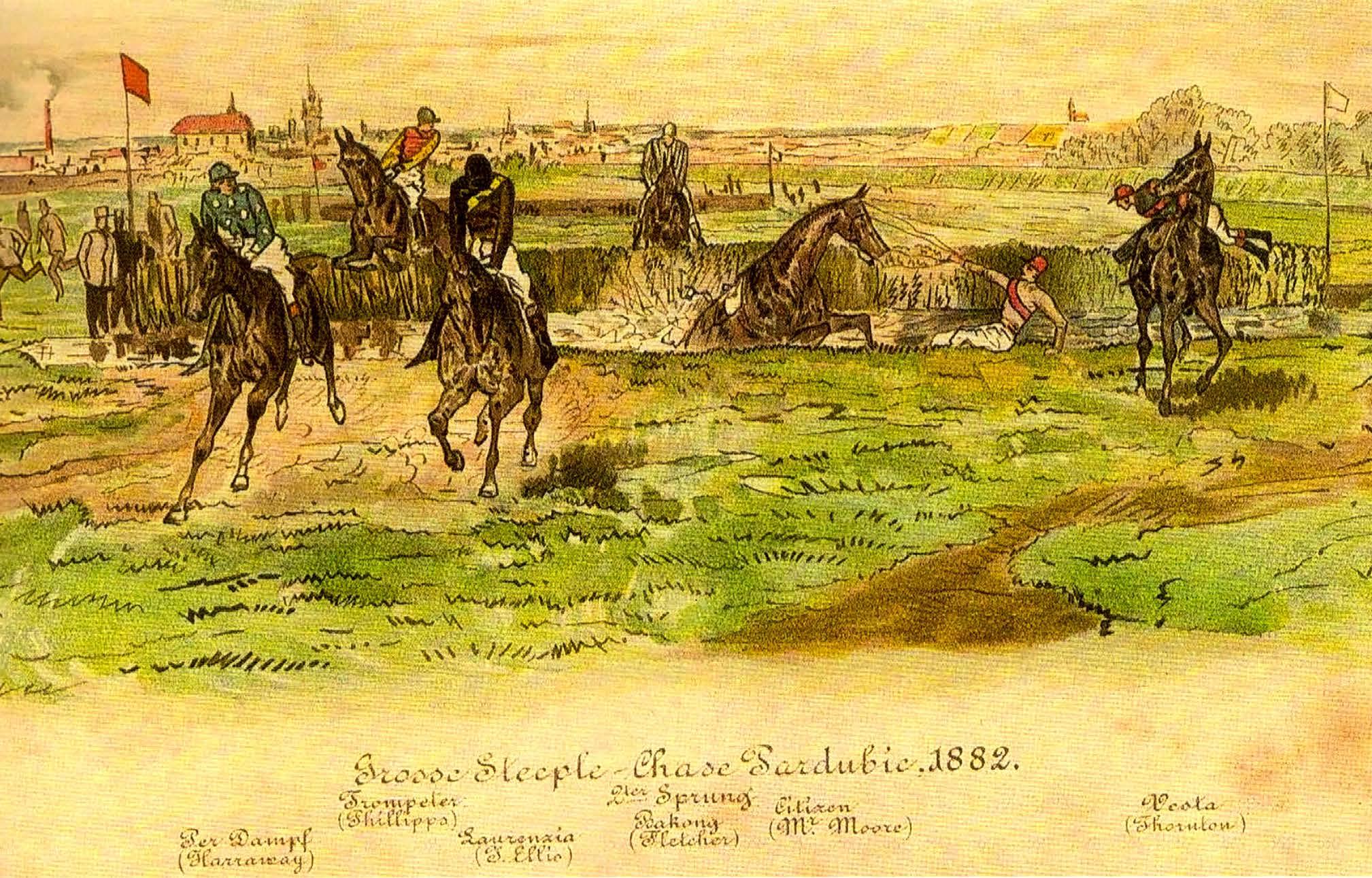 Překážka číslo 2 v roce 1882. Zleva klisna Per Dampf (T. Harraway), vedle ní Laurenzia (J. Ellis), nad překážkou Trompeter (M. Phillips) a před skokem Bakony II (R. Fletcher). Citizen (W. H. Moore) padl do příkopu, Vestu nasedá jezdec H. Thornton. Umístění náspu železniční trati Pardubice–Chrudim odpovídá skutečnosti, pardubická Zelená brána a hrad Kunětická hora z tohoto pohledu nemohly být vidět. (archiv autora)
