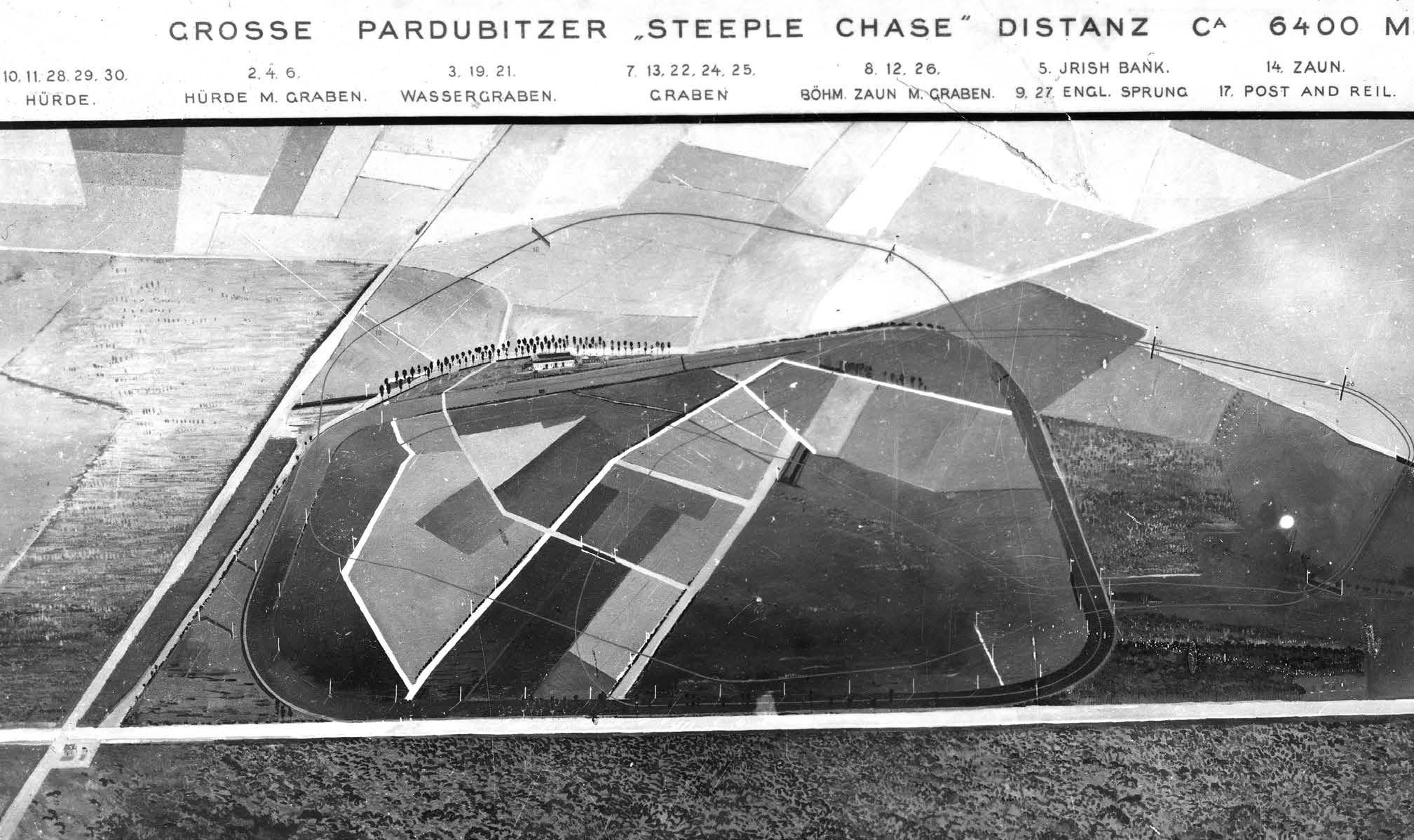 spolku převzal mimo pořádání pražských dostihů také uspořádání dostihů v Pardubicích. Pravidla platná pro pražskou dráhu platí i pro tuto nově zřízenou dráhu. Městečko Pardubice je vzdáleno 14 mil od Prahy (1 německá míle = 7,5 km). Je tam dostatek noclehů pro značný počet hostů a četné stáje jsou plně vyhovující.
