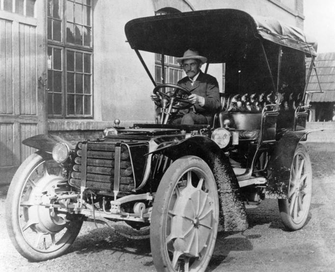 V roce 1906 Ferdinand Porsche zkonstruoval svůj první vůz poháněný spalovacím motorem – Austro-Daimler Maja. dole
