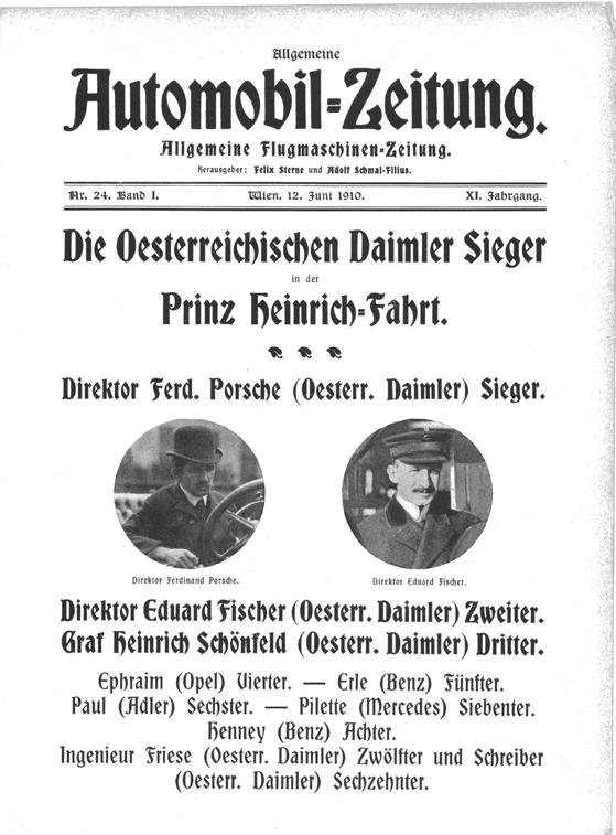Vídeňský list Automobil Zeitung z 12. června roku 1910 věnoval informaci o vítězství Ferdinanda Porsche celou titulní stranu. následující strana