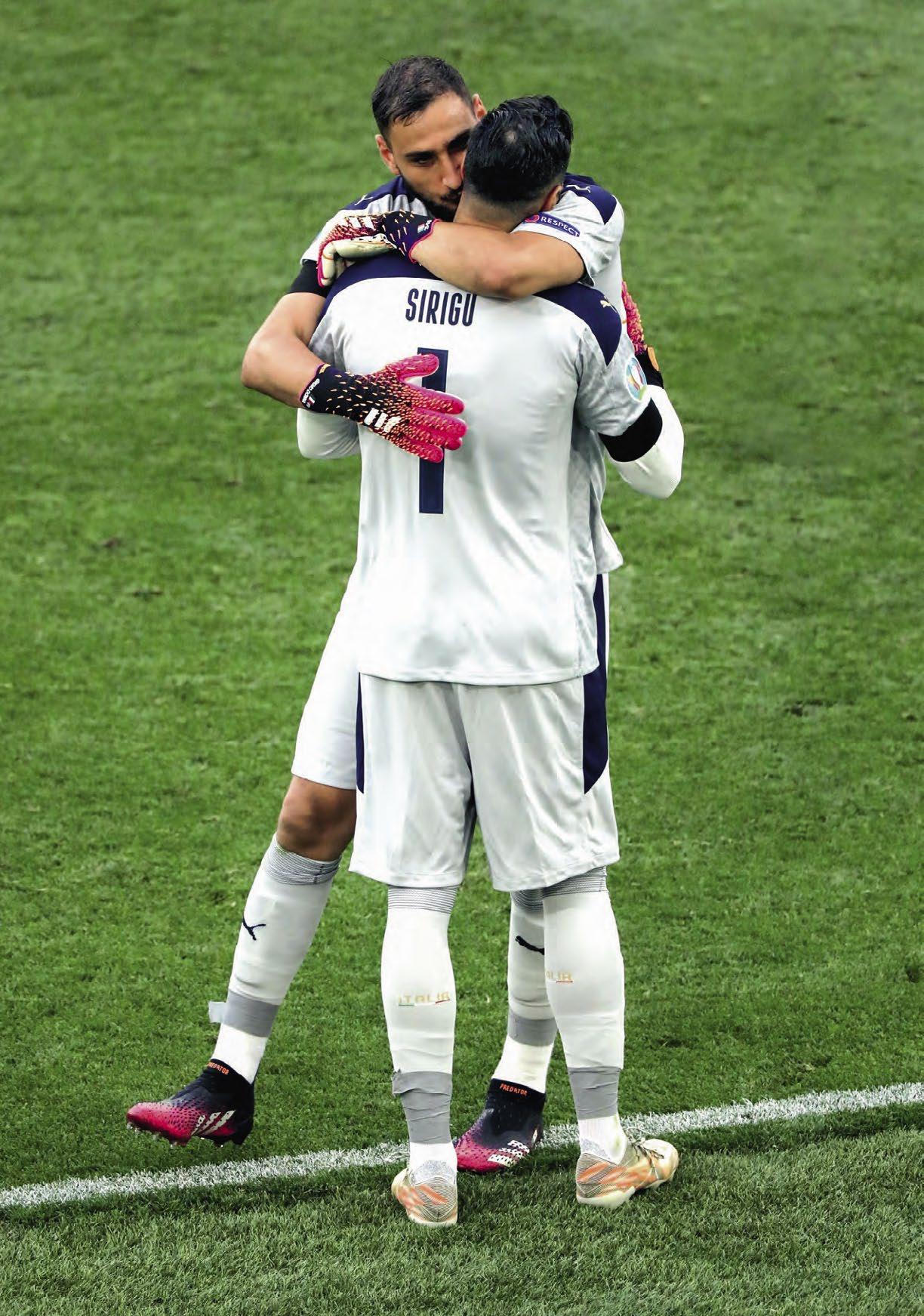 Postupem času expertní skupina nabídla tři borce, kteří se měli o nejcennější individuální trofej poprat během vrcholného klání ve Wembley. Anglický rychlík Raheem Sterling vypadl, neboť ho italská defenziva naprosto vymazala. To samé brazilský Ital Jorginho, jenž na turnaji udivoval přehledem a důvtipem. Ublížilo mu, že v závěrečném rozstřelu selhal. Jeho střela narazila do tyče, zato kolega Gianluigi Donnarumma na brankové lajně zářil. A zdaleka nejen ve finále! Dvaadvacetiletý mládenec může časem překonat i svého legendárního předchůdce Gianluigiho Buffona. Gigi a Gigio. Gigio a Gigi. Oba božsky talentovaní, přesní, inteligentní, přizpůsobiví, téměř za všech okolností nad věcí, výteční organizátoři obrany. Buffon měl o něco silnější charisma, ale pozor, Donnarumma má spoustu času, aby nabral ještě daleko větší kredit. Kdybyste viděli, jak se zachoval, když Angličanům chytil poslední penaltu... Neprováděl žádná zbytečně okázalá gesta, která by prozrazovala jeho napolitánský původ. Prostě se vrhnul po střele, která určila mistry Evropy, v klidu vstal a udělal pár netečných kroků, než ho povalili ječící spoluhráči.