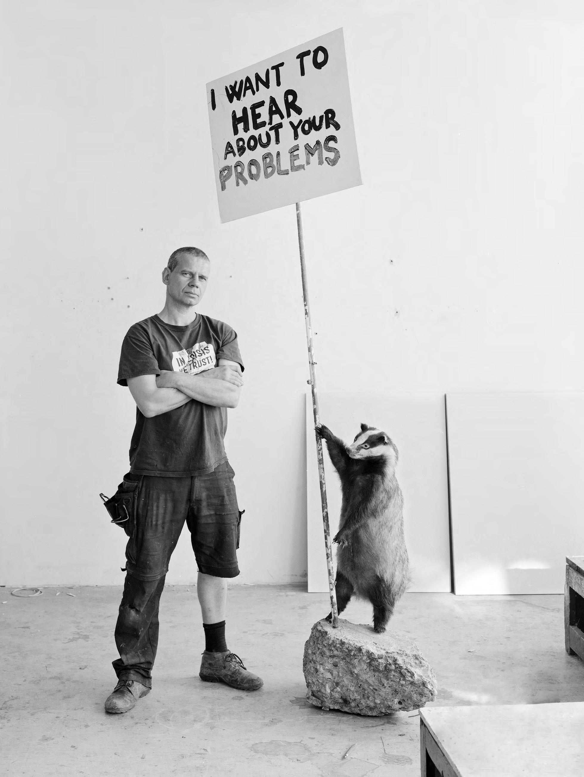 Proboha hlavně ne „kutil“! To je přesně to, jak jsem nechtěl dopadnout! Ale takovej je život, snažíš se, makáš, a nakonec jseš někdo, kdo jsi nechtěl být, hahaha! I to se holt může stát. Hele, rozhodně ty věci nesmíme adorovat nebo zveličovat, ale mám jich víc, který mě provázejí. Tak třeba To . Myslím to s velkým T z poloviny 90. let, kdy jsem studoval. Tehdy mě zajímalo, co je vlastně umění a kde ho hledat, a co se stane, když ho umístíme jinam než do galerie nebo do muzea. Obstojí vůbec v prostředí, které ho jako galerie nechrání, ale staví ho naopak do srovnatelné pozice s obyčejným předmětem? Narozdíl třeba od kladiva nebo sklenice však nemá jasně definovanou funkci. A to ho právě odlišuje od všedního světa, a to je úžasný! Brával jsem s sebou To do metra, k doktorovi, na nákupy, na poštu, na všemožný pochůzky, abych zjistil, co se děje, když vezmeš umění na procházku. Máš pravdu s Revolution, tím klukem, co mlátí hlavou do zdi. Kdybys mě přirovnal ke kapele, Revolution je moje hitovka a lidi se na něj často ptají. Nebo se můžeme bavit o dlouhodobějších