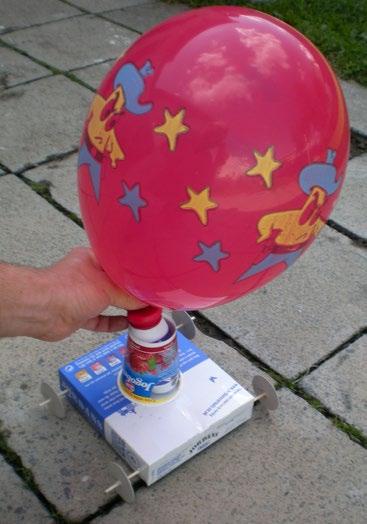 Vyrobte si tiež vzduchom poháňané auto! Bude mať síce jed noduchšiu konštrukciu ako predchádzajúci automobil, pretože namiesto piestového motora bude poháňané reaktívne, ale zá bavy si s ním napriek tomu užijete dosť. Čo myslíme tým reaktív nym pohonom? Spomeňte si na zákon akcie a reakcie, o ktorom ste sa učili vo fyzike. Ako nádrž so stlačeným vzduchom poslúži na našom autíčku jednoduchý nafukovací balónik. Jeho hrdlo je navlečené na fľaštičke od Actimelu (alebo inej vhodnej malej plastovej fľaštičke), v bočnej stene ktorej je vystrihnutý otvor, slúžiaci ako dýza. A pretože vzduch vychádza dýzou na jednu stranu, rozbehne sa autíčko podľa zákona akcie a reakcie na opačnú stranu.