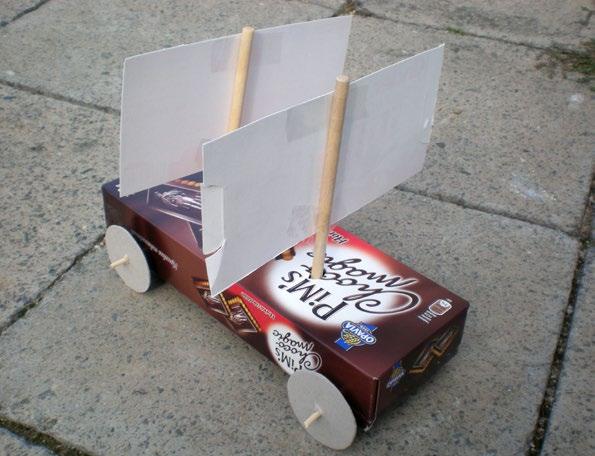 Čo takto vyrobiť si svoj model plachtového vozidla? Nie je nič jednoduchšie! Môžete na to totiž použiť váš predchádzajúci výrobok – autíčko poháňané balónikom, ktoré trošku prestaviate. Odstráňte téglik prilepený na hornej strane a nahraďte ho jedným alebo viacerými stožiarmi s plachtami. Stožiare vyrobte zo špajdlí alebo drevených tyčiek, plachty môžu byť z papiera. Rovnako ako Stevin vložte na dno vozidla nejaké kamene ako záťaž, aby nebolo také vratké. Počkajte na priaznivý vietor a vyskúšajte, či bude vaše vozidlo schopné jazdy.