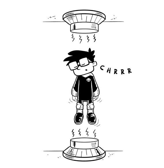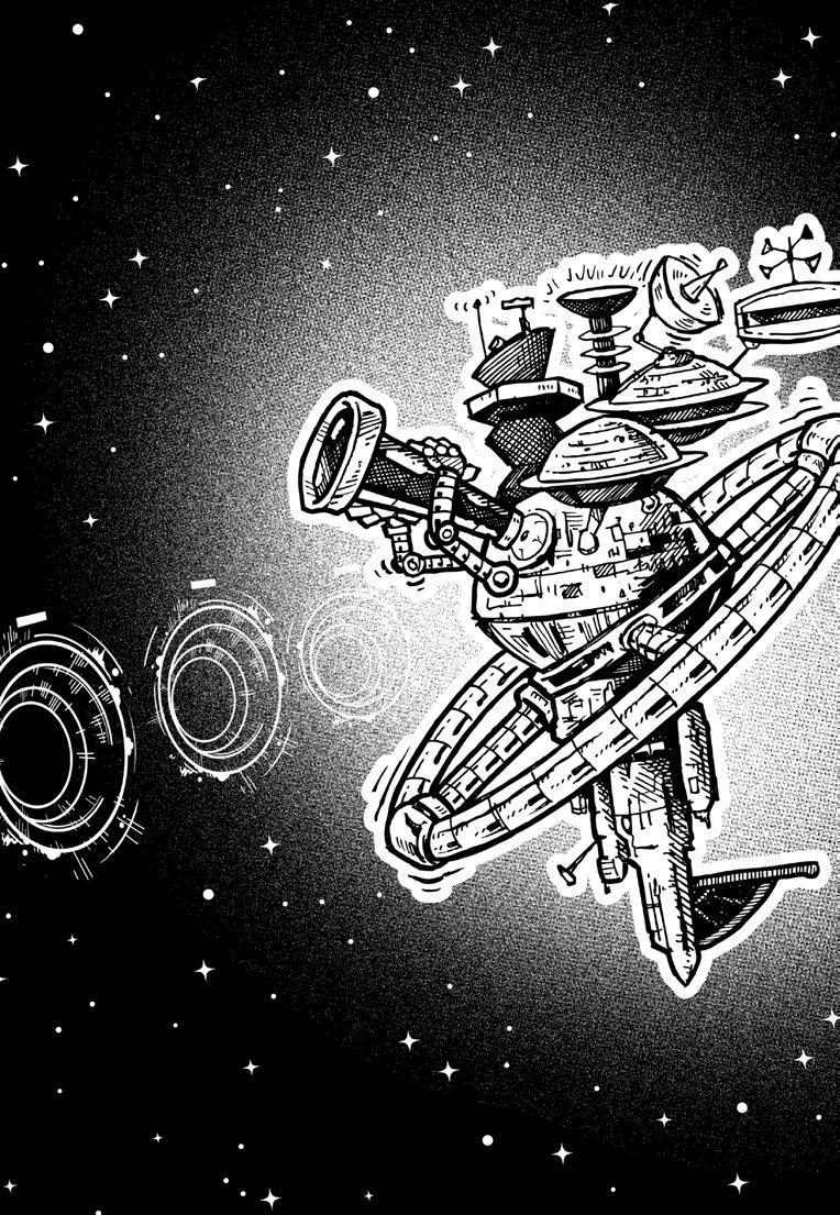 To akože fakt? Mama a oco čakajú, že ráno vstanem a pôjdem do školy? Po 529 600 000 000 000 000 kilometrov dlhej ceste cez Galaxiu? A to nie som žiadne ranné vtáča. Ani nemôžem predstierať, že som chorý – nie v tomto sterilnom prostredí vesmírnej stanice. Nijaké bacily = nijaká choroba. Nikdy. Dokonca ani nádcha. Aspoň som sa v noci dobre vyspal. Kapsuly s nulovou gravitáciou v našom bývastore sú oooveľa pohodlnejšie ako normálne postele. A môžete spať postojačky, takže zaberajú menej miesta.