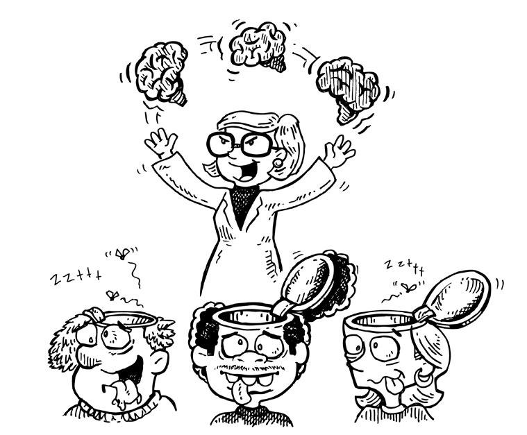 Nie, nie takto. Pracuje s mozgami, ktoré sú v hlavách. Aspoň mi to tvrdí. I keď by bolo fakt super, keby bola šialený vedec!