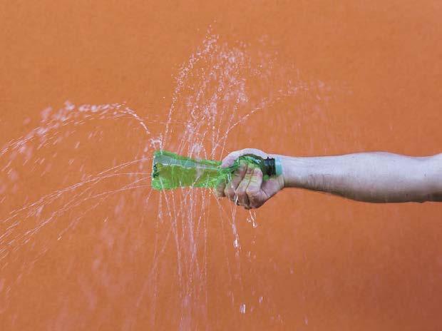 Predsa stlačiť fľašu! Tlak sa prejaví tým, že voda bude z dierok striekať. Bude to na niektorú stranu viac alebo všade rovnako?