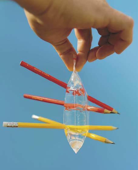 Stena vrecka sa totiž okolo ceruzky tak stiahla, že voda neprejde. Skúste pridávať ďalšie ceruzky. Ceruzky zároveň pôsobia v otvoroch ako zátky, takže ak ceruzku vytiahnete, voda vytečie. Je to podobné, ako keď kolesom prejdete po pripináčiku. Kým je zapichnutý, vzduch neuniká, ale keď ho vytiahnete, koleso sa hneď vyfučí.