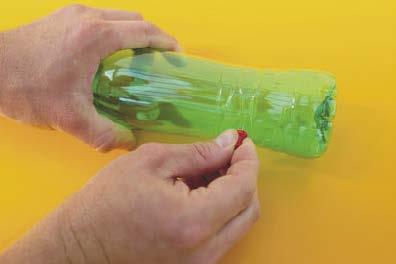 4. Stred povrázka prevlečte zospodu hrdlom druhej polovice fľaše a navlečte podeň ceruzku, aby nevykĺzol. Tým je váš model žmýkačky pripravený na použitie.