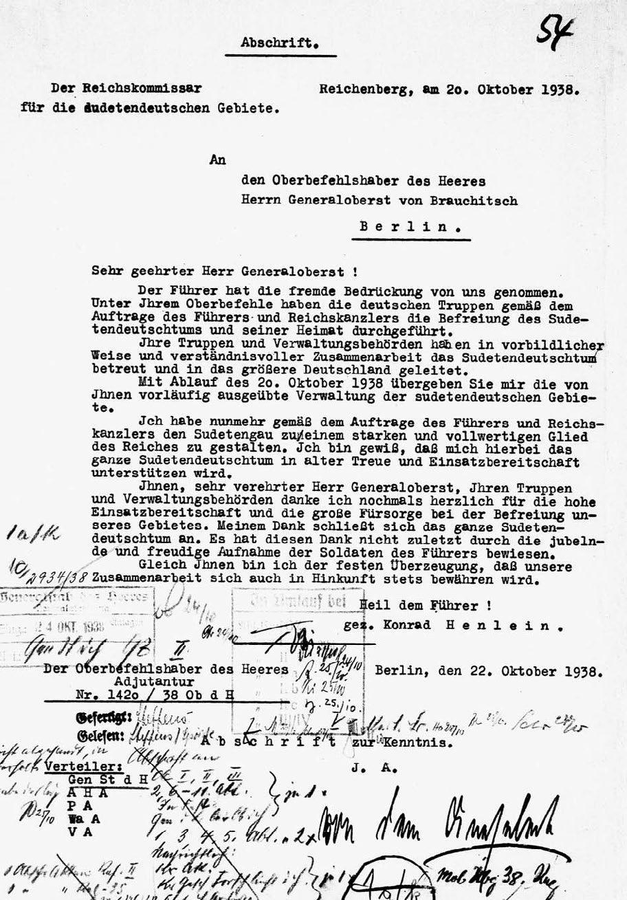 Obsazení sudetoněmeckého území s nasazením všech částí armády, Luftwaffe, policie, jednotek SS-Verfügungstruppe, SS a SA je ukončeno. Pod ochranu Wehrmacht bylo vzato 3,5 milionu německých soukmenovců, kteří se s konečnou platností vrátili do Říše. Jejich opatrování přebírá 21. října 1938 civilní správa. Současně Vás uvolňuji z pověření plnění výkonné moci s uznáním za plnou spolupráci na všech stupních.