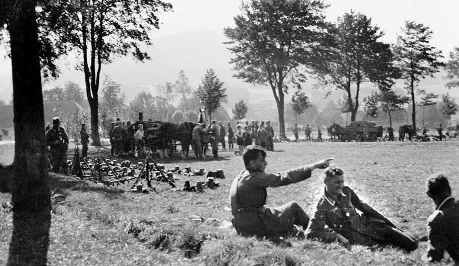 Ve dnech odpočinku a o večerech jsme seděli přesně jako vy u reproduktorů, poslouchali zprávy a zvažovali možnosti mírového řešení. 26. 9. jsme pochodovali s ostře nabitými puškami pod Pomezními Boudami do Niederschreibendorfu. Niederschreibendorf bylo výchozí místo pro náš poslední pochod k hranici. Tyto přesuny celých jednotek, které se mnohým z vás možná mohly zdát nepochopitelné, a také se našim vojákům nepochopitelné zdály, měly samozřejmě zvláštní význam. Teprve poprvé jsme pochodovali za bílého dne a dali tak nepřátelské špionáži možnost sledovat tyto přesuny jednotek. Záměrně jsme dva dny viditelně a zdánlivě bezmyšlenkovitě měnili ubytovací prostory, protože jsme předpokládali, že nepřítel bude zmaten místem našeho skutečného nasazení. Navíc se tak zamezilo tomu, aby jednotka poflakováním v ubytování zakrněla. V Niederschreibendorfu jsme slyšeli Vůdcovu řeč, ve které již docela jednoznačně řekl, že pokud to bude nutné, prosadíme naše právo i silou. Asi nejvíce nabitým dnem bylo pro nás 28. 9. v Rudelstadtu. My důstojníci jsme byli velitelem pluku svoláni na poradu. Zde nám bylo v přísné tajnosti sděleno, že dnešním dnem je u pluku uskutečněna mobilizace. Kostky byly vrženy a museli jsme se připravit do všech důsledků. Byly otevírány všechny tajné dopisy, které byly připraveny již měsíce dopředu a směly být otevřeny pouze v první mobilizační den. Byly vydávány identifikační známky, balíčky první pomoci atd. Jednotka obdržela rozkaz bez varování sestřelit každé letadlo, které nebude označeno trámovým křížem. Není nutno připomínat, že jednotka se co nejsilněji jistila i během spánku a zároveň byla jištěna dalšími jednotkami naší armády, především Lu�waffe. 29. 9. byl vyhlášen noční poplach a odpochodovali jsme směrem na frontu. Mapy generálního štábu jsme důkladně studovali a s prostorem našeho nasazení jsme byli, alespoň podle map, velmi dobře seznámeni. Náladě v jednotce a náladě nás starých frontových vojáků věnuji samostatnou kapitolu. Můžete být ujištěni, moji kamarádi, že právě staří frontoví vojáci nevyrazili s žádnou tzv. hurá-náladou. Zažili jsme za války příliš a věděli jsme, co nás čeká jako útočnou rotu první linie. Oddíl byl v nejlepší náladě, ale to nelze srovnávat s rokem 1914. Dnešní voják byl poučený a vážný, měl ale větší smysl pro povinnost a zodpovědnost. Pro mne jako záložníka