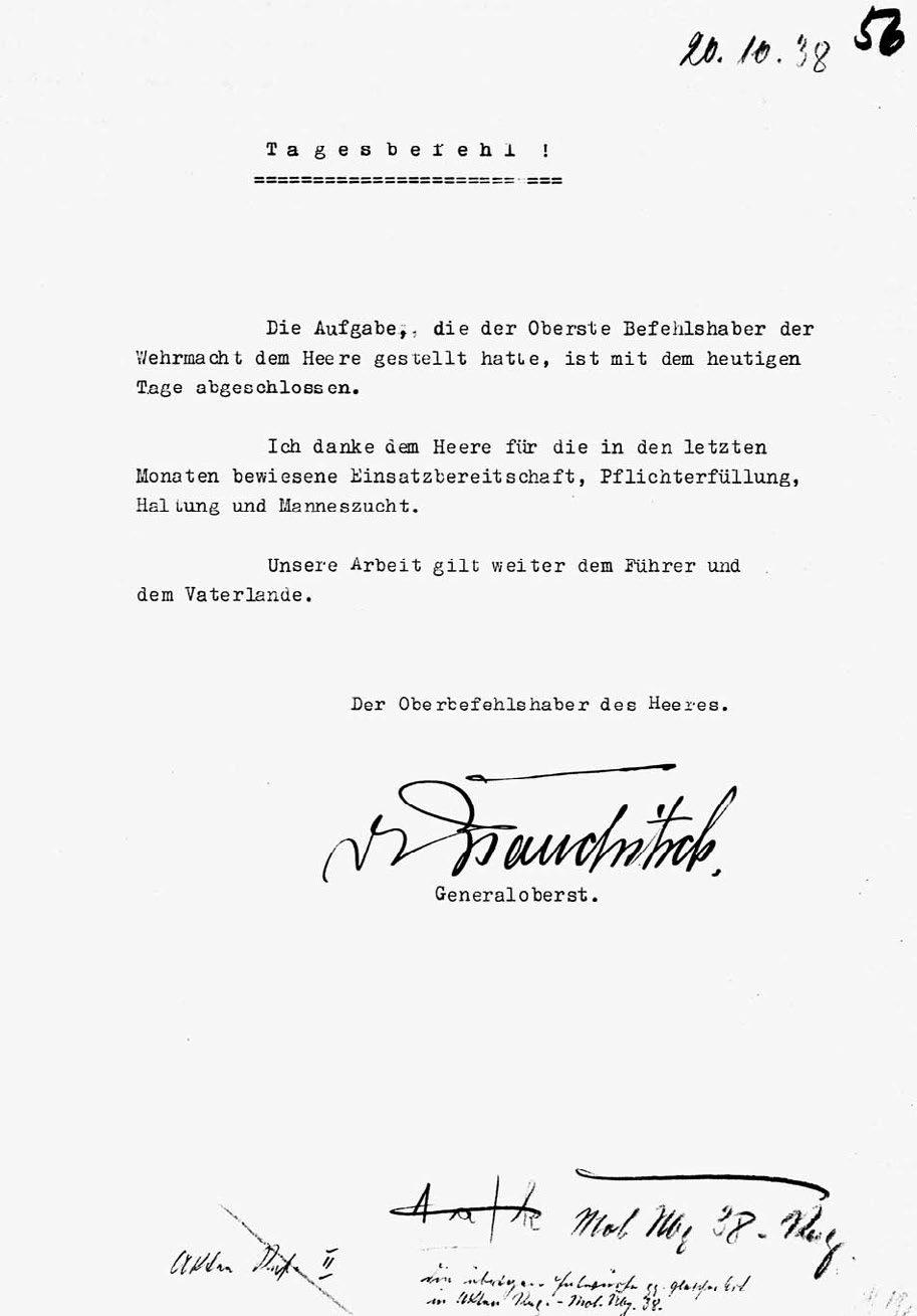 Denní rozkaz vrchního velitele pozemní armády Gen. Obersta von Brauchitsche ze dne 20. října 1938 určený podřízeným jednotkám informuje o ukončení vojenského nasazení v Sudetech.
