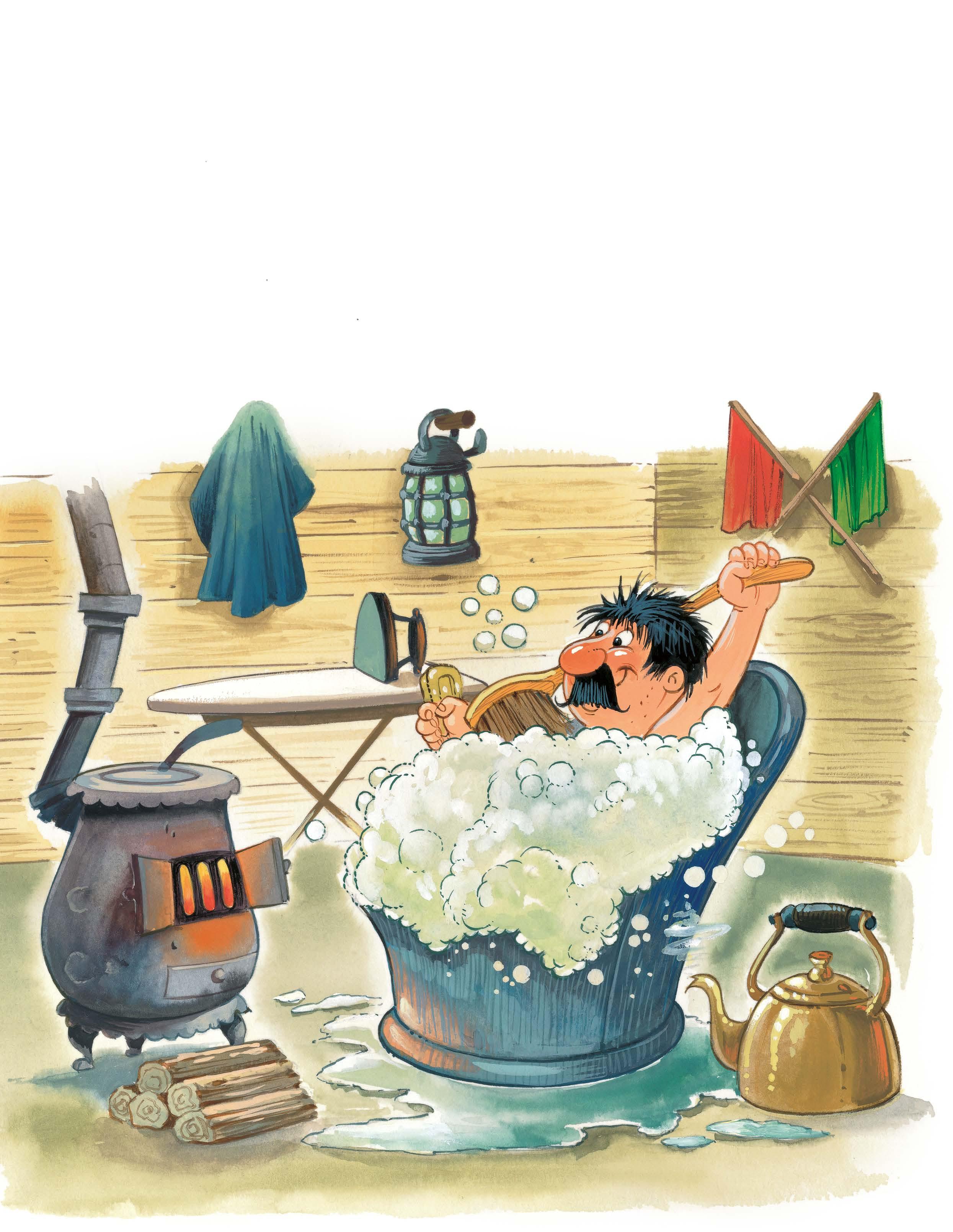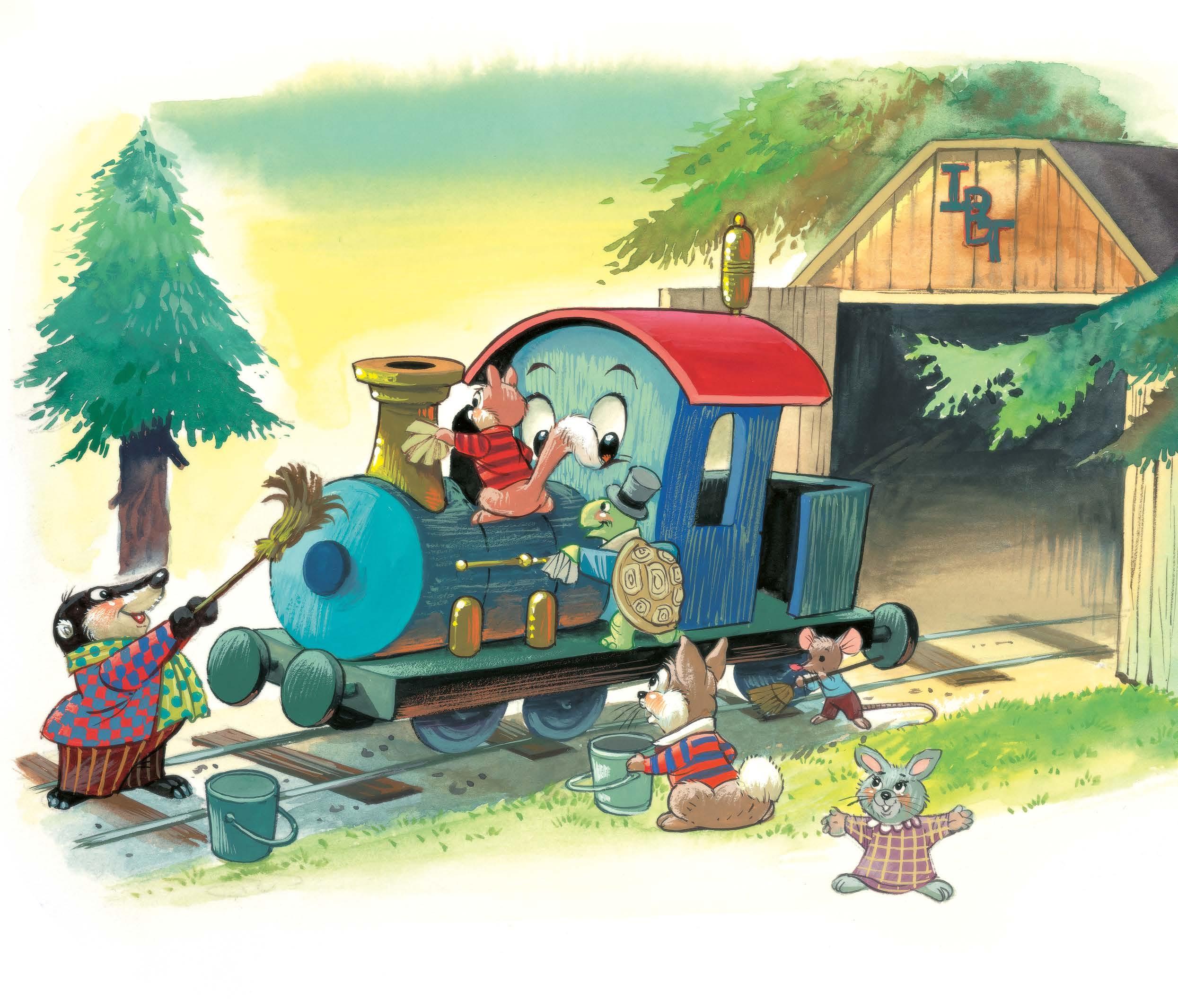 Hluboko v Jedlovém lese bylo dnes rušno. Modrá mašinka se koupala. Králíci nosili od řeky vědra s vodou, Boris Jezevec cákal na kotel modré mašinky mydlinky a roztíral je velkým mopem. Na modré mašince seděl Sid Veverka a čistil hadrem komínek. Fred Myšák umýval kartáčem kola. A Tonda Želvák usilovně leštil mosazné zábradlí po obou stranách kotle, aby se lesklo jako zlato. Ale kde byl strojvedoucí Bob?