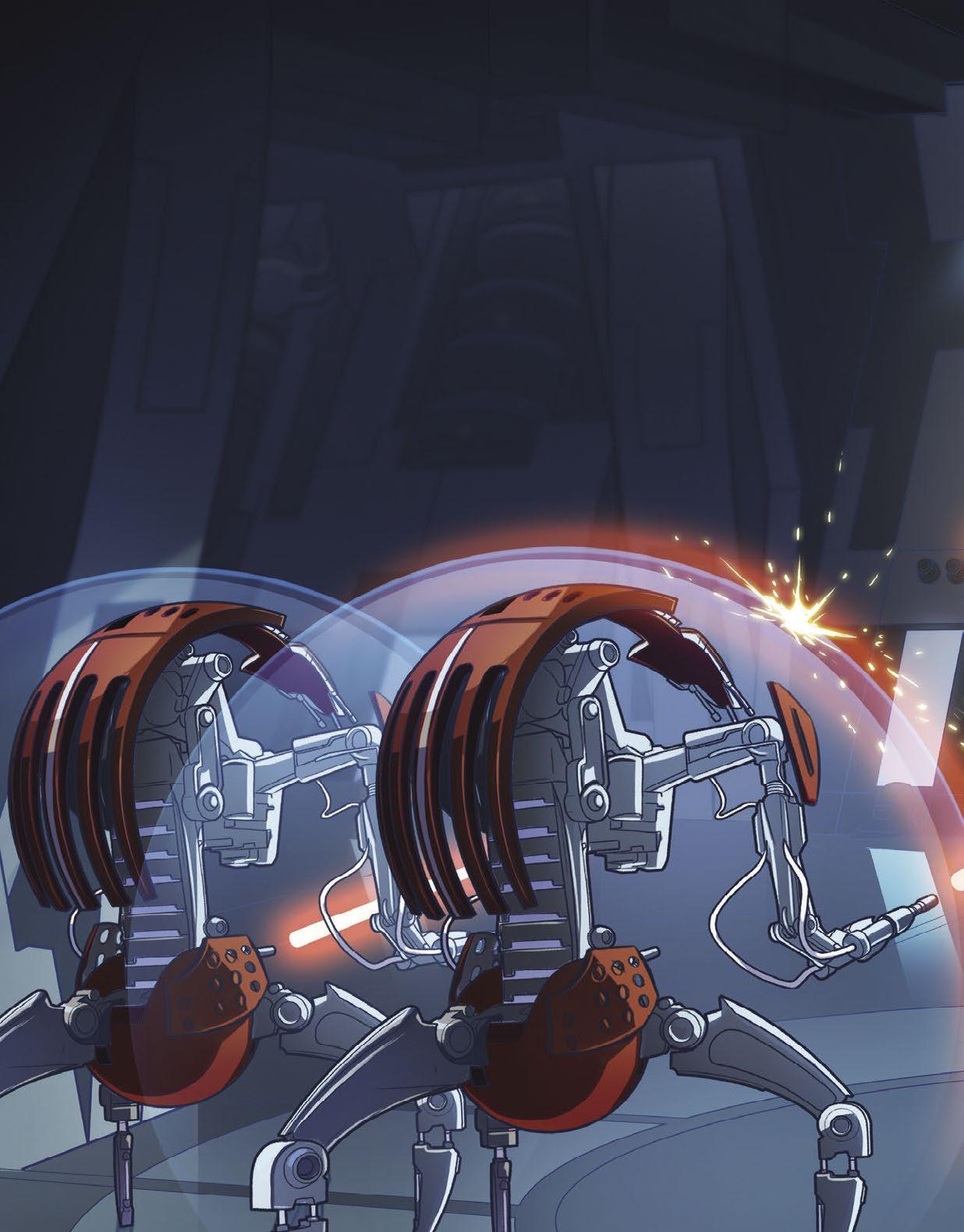 Bitevní droidi byli ozbrojeni výkonnými blastery, ale Jediové odvrátili každou střelu světelnými meči. Mocné zářivé čepele se míhaly ve vzduchu a ze zasažených droidů odletovaly jiskry. Jediům se nakonec podařilo všechny protivníky porazit.