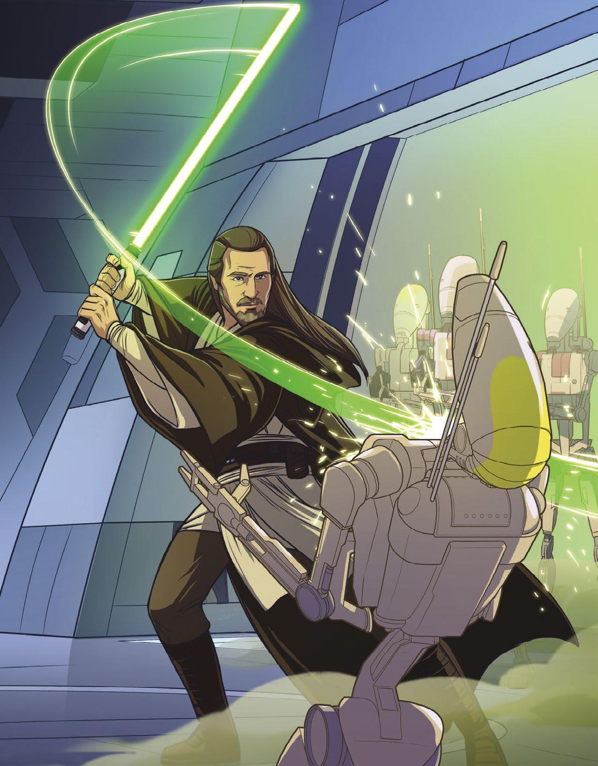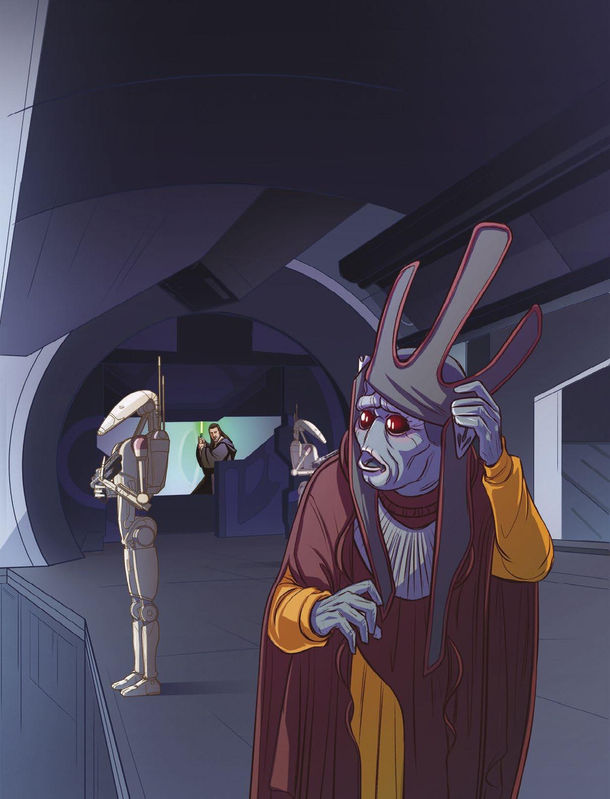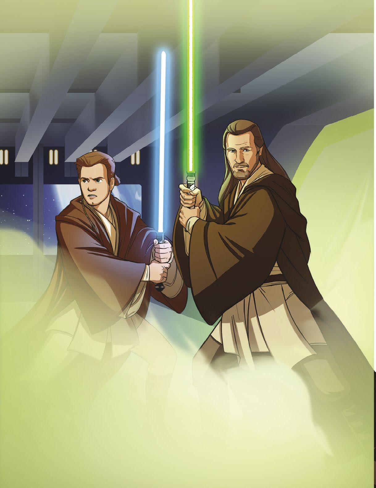 „Pojďme,“ pobídl Qui-Gon Obi-Wana, aby vyrazili. Oba Jediové zmizeli za rohem na druhém konci dlouhé chodby, než je nepřátelé stihli zastavit.