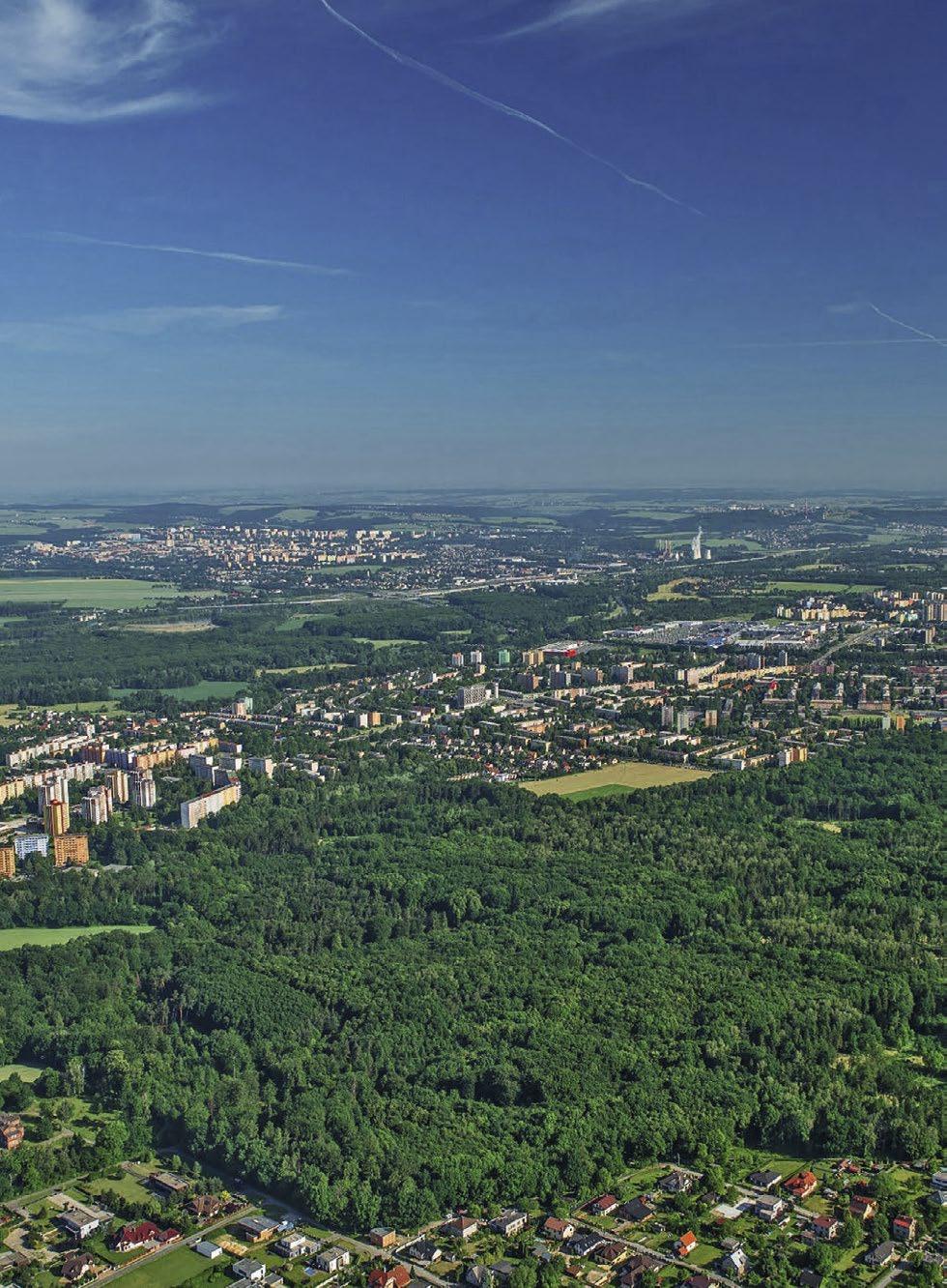Letecký pohled na Ostravu od jihu směrem na severozápad, v popředí část Bělského lesa, za ním sídliště Nové Výškovice, v pozadí Poruba.
