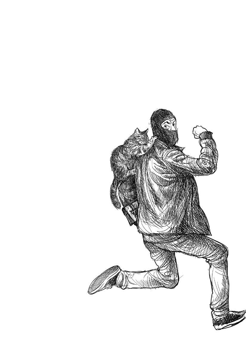 Zajímalo ho něco jiného. Vytáhl jednu knihu a podíval se, kolik stojí. Vytáhl druhou a udělal to samé. Tak prohlídl všechny knížky v regále. K jedné z nich se vrátil a začal si jí listovat. Byla malá, vázaná v kůži a zdobená zlatými ornamenty. Chlap se rozhlédl a pomalu si rozepnul bundu. Byl v krámku sám. Ještě jednou knížku otevřel, zavřel a šup s ní pod bundu. Chvíli dělal jakoby nic a pak vykročil. A to neměl dělat! Ámos se prudce odrazil a s vytasenými drápy skočil chlapovi rovnou na hlavu. Ten bolestí vykřikl, ztratil rovnováhu a spadl na kolena. Knížka mu vyletěla ven z rozepnuté bundy, ale nechal ji být. S vřeštícím a škrábajícím kocourem na zádech se plazil po kolenou rychle ke dveřím. Marně se snažil utéct a kocoura setřást.