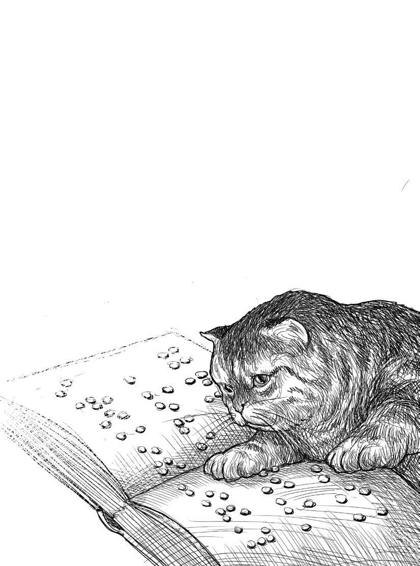 „Ale jde,“ řekla babička a postavila kocoura na zem. Pak vstala a z regálu za zády vytáhla velkou knihu. Otevřela ji a vzala si kocoura zpátky na klín. „Podívej se,“ uchopila ho za jeho pravou pacičku a pomalinku mu s ní přejížděla po otevřené stránce. Ta byla plná malinkých důlků a hrbolků.