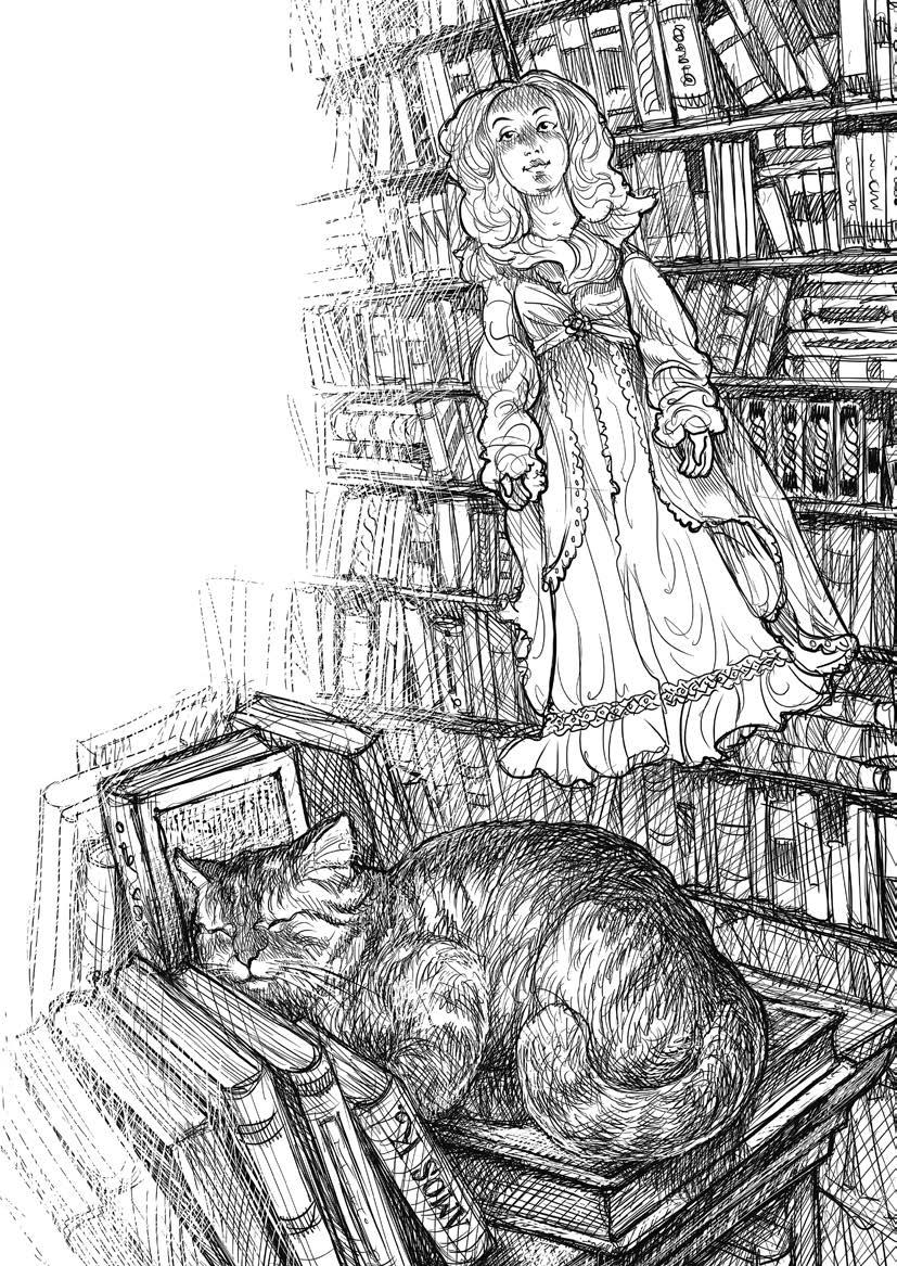 Kocour nad tím hudrováním jen mávl packou. Nabaštil se a po dřevěném regále se vyšplhal až pod strop, do svého milovaného pelíšku. Jednou zjistil, že je tam nejtepleji, a už se tam usadil natrvalo. Byla to jeho rozhledna. Viděl z ní do všech stran a koutů. Ležel na starém atlasu světa a připadal si jako kapitán velké lodi. Jako objevitel. A mělo to své výhody. Málokdo totiž o něm v krámku věděl. Byl strážcem nejen babičky Pěničky, ale hlavně jejích knih.
