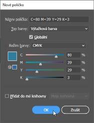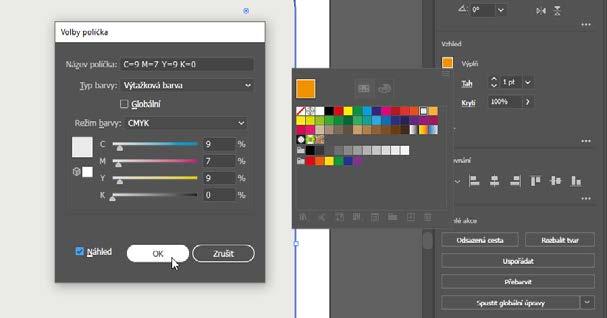 • Změňte jednotlivé hodnoty barev CMYK na C=9, M=7, Y=9, K=0. Po zadání poslední hodnoty stiskněte Return nebo Enter, čímž změnu potvrdíte a panel zavřete.