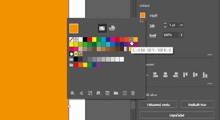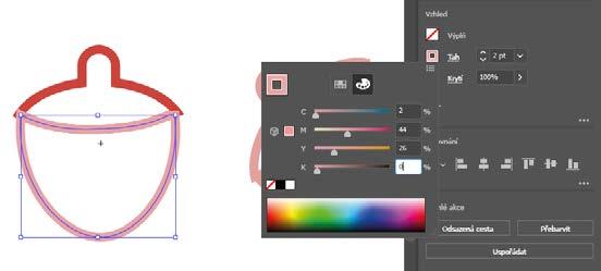 10 V panelu Vlastnosti (Properties) klepněte na políčko barvy Tahu (Stroke) a v horní části panelu klepněte na tlačítko Směšovač barev (Color Mixer) ( ), abyste si mohli vytvořit novou barvu. Změňte hodnoty barev na C=2, M=44, Y=26, K=0. Po zadání poslední hodnoty stiskněte klávesu Return nebo Enter, čímž změnu potvrdíte a panel zavřete.