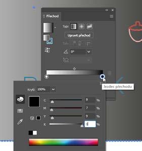 • Poklepejte na malou černou barevnou zarážku ( ) na pravé straně jezdce přechodu v panelu Přechod (Gradient) [na obrázku je zakroužkována).