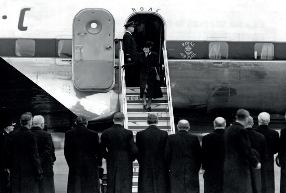 Alžběta II. vystupuje ve smutečních šatech z letadla, které ji 8. února 1952 přivezlo z Keni.